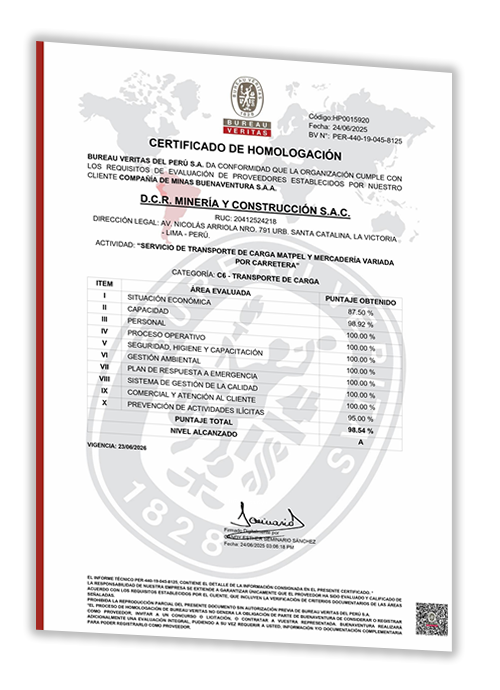 Certificado de homologación D.C.R. Mineria Y Construccion S.A.C. - Bureau Veritas