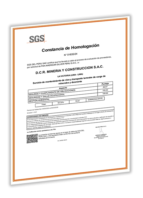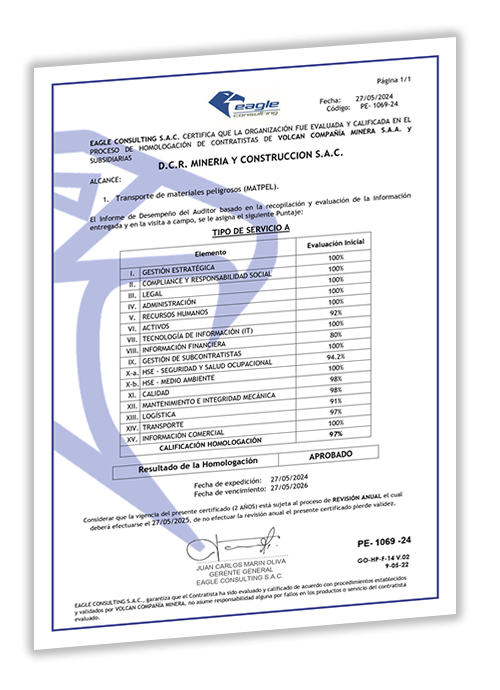 Certificado de homologación D.C.R. Mineria Y Construccion S.A.C. - Volcan
